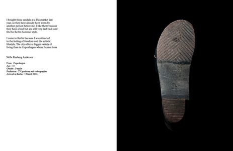 世界中から国籍の違う人々が集まるベルリン 。イタリア、トルコ、スイス、チェコ、メキシコ、イラン、デンマーク、ブラジルからベルリンに来た人の靴を撮影。国籍、年齢の違う人になぜあなたは、ベルリンに来たのか?あなたが履いている靴をなぜ違う国まで持って来たのかを質問したストーリー。思入れのある靴は手放せない理由がある。いつでもブラジルを思い出したいからわざわざブラジルからベルリンにサンダルを持って来たり。遠距離恋愛相手の身長が高いからヒールの高い靴を履かないとKissできないなど。あなたには母国を離れて違う国に持って行く手放せない靴はありますか??